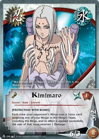 este unul din cei mai loiali subiecti ai lui orochimaru fiind dispus sa isi dea viata pentru ca orochimaru sa isi indeplineasca visul.Abilitatea lui kimimaro poarta numele de Shikotsumyaku si consta in faptul ca acesta poate sa isi foloseasca oasele ca arme putand sa creeze altele oricand la nevoie.El moare in urma luptei contra lui gaara cerandu-si scuze fata de orochimaru ca nu a putut sa ii incetineasca mai mult pentru ca sasuke sa ajunga la orochimaru
